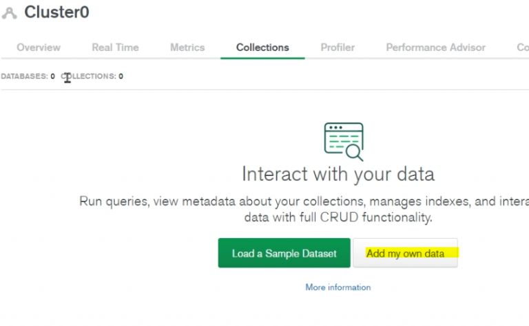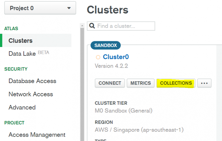 โผ 1. MongoDB Atlas ๋ฉ์ธ ๋์๋ณด๋์์ Collections ๋ผ๋ ๋ฒํผ ํด๋ฆญ