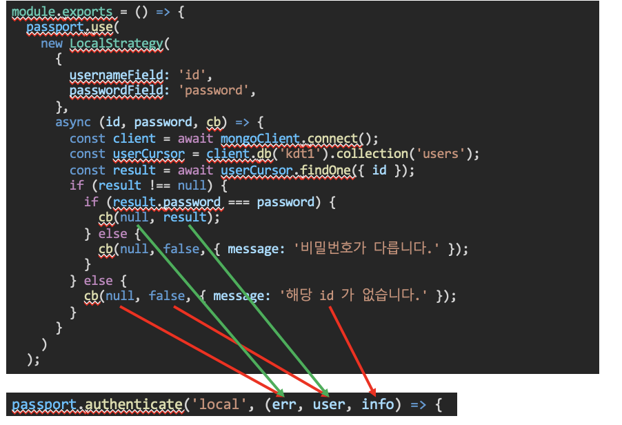 cb(null, false, { message: '๋น๋ฐ๋ฒํธ๊ฐ ํ๋ ธ์ต๋๋ค.' });