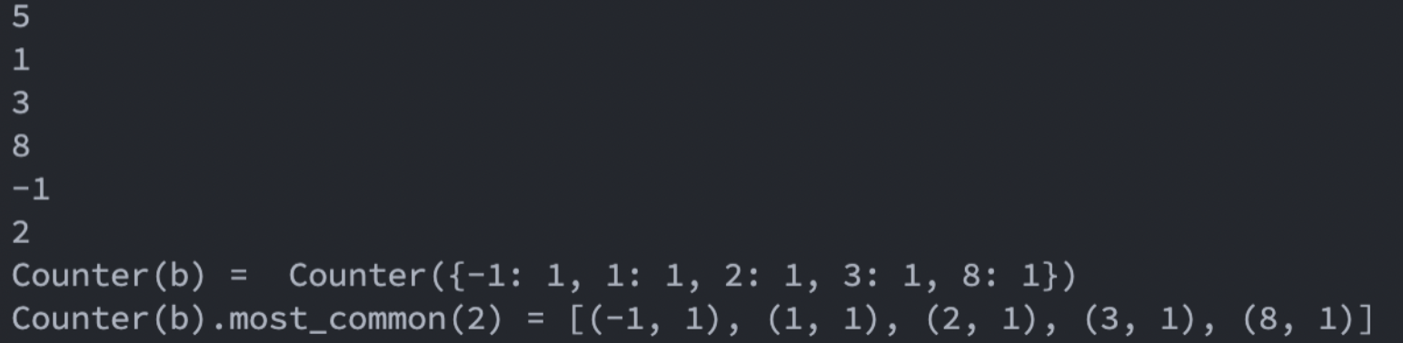 print("Counter(b).most_common(2) =" , Counter(b).most_common())