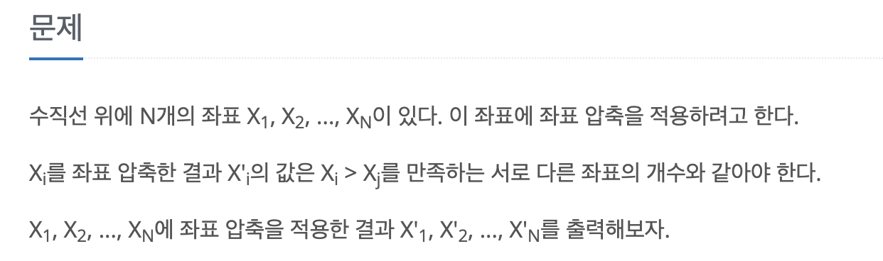 ์์ง์ ์์ N๊ฐ์ ์ขํ X1, X2, ..., XN์ด ์๋ค. ์ด ์ขํ์ ์ขํ ์์ถ์ ์ ์ฉํ๋ ค๊ณ ํ๋ค. Xi๋ฅผ ์ขํ ์์ถํ ๊ฒฐ๊ณผ X'i์ ๊ฐ์ Xi > Xj๋ฅผ ๋ง์กฑํ๋ ์๋ก ๋ค๋ฅธ ์ขํ์ ๊ฐ์์ ๊ฐ์์ผ ํ๋ค. X1, X2, ..., XN์ ์ข
