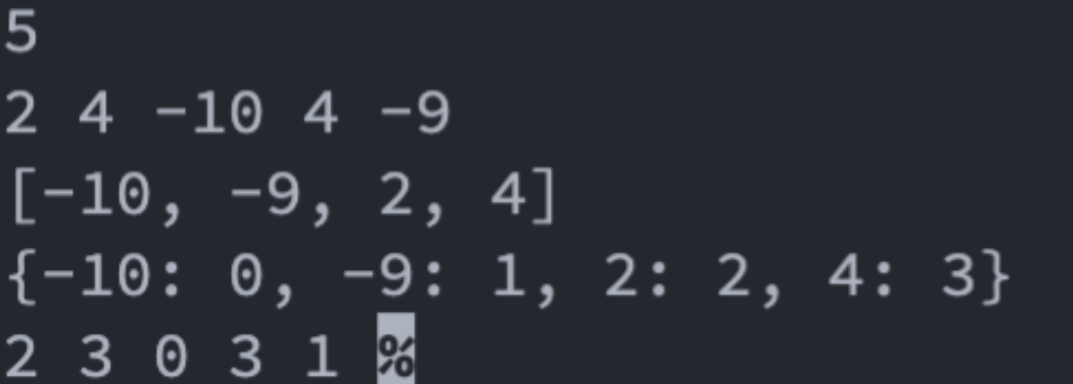 # dic = {1: 0, 0: 1, 2: 2, -4: 3, 6: 4, 33: 5, 22: 6}