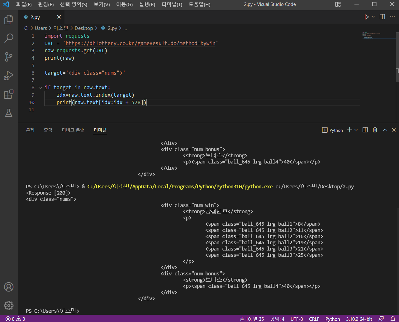 ๋ก๋ ๋น์ฒจ ๋ฒํธ ์ฌ์ดํธ๋ฅผ ํฌ๋กค๋งํ๊ธฐ๋ก ํ์๋ค.